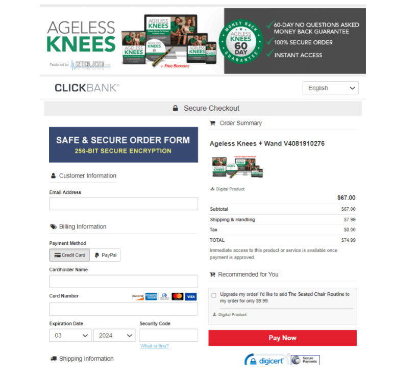 We take your online security very seriously, so you can feel confident that your credit card and personal details are fully protected when purchasing Ageless Knees™. All transactions are handled through ClickBank, a trusted platform with years of experience in secure online payments, ensuring your purchase is safe and private.