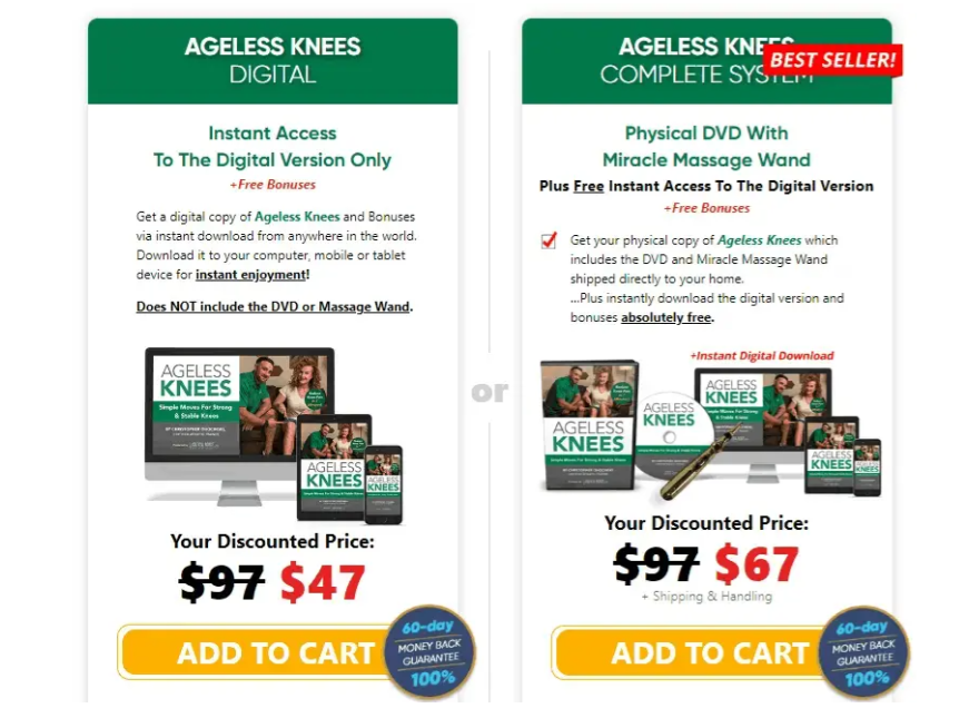 The creators of Ageless Knees™ have built a risk-free 60-day money-back guarantee into every order. If the program doesn’t meet your expectations, or you’re not fully satisfied for any reason, you can request a complete refund—no questions asked.